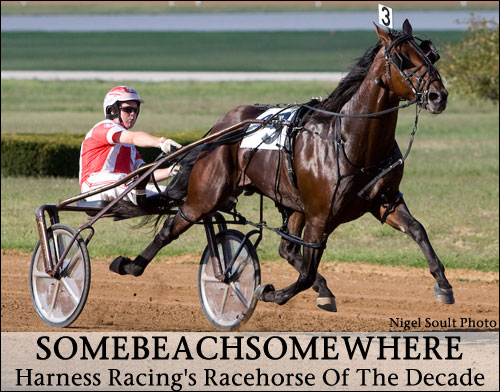 Where does Somebeachsomewhere rank among the best standardbreds to ever look through a bridle? A berth in the Canadian Horse Racing Hall of Fame a mere nine months after he finished his racing career speaks volumes. Now he's the selection as harness racing's racehorse of the decade.