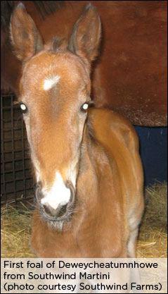 Southwind Farms, of Pennington, New Jersey has announced that the first foal by World Champion and Hambletonian winner Deweycheatumnhowe 3,1:50.4 ($3,177,112) has been born at its farm.