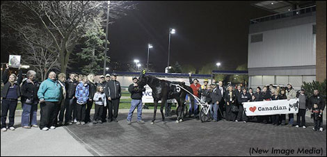 Following the race, the popular trotter returned to the winner's circle in front of a cheering crowd of fans decked out in black representing his saddle pad colour.