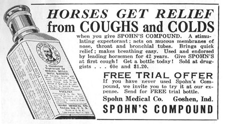 "At the first sign of a cough or cold in your horse, give a few doses of "Spohn's". It will act on the glands, eliminate the disease germ and prevent further destruction of body by disease. Spohn’s has been the standard remedy for Distemper, Influenza, Pink Eye, Catarrhal, Fever, Coughs and Colds for a quarter of a century. Price 60 cents & $1.15 per bottle at all Drug Stores. SPOHNS MEDICAL Co. Goshen, Indiana." It was heralded as being for horses, mules, dogs and rabbits as well as poultry. For those who had yet to try it, a free bottle was available simply for the asking. Most horse people also kept a bottle of this product nearby.