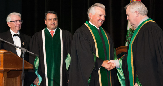 Former UPEI Chancellor Bill Andrew (right) congratulates Dr. Don McDougall at the Installation ceremony. Lieutenant Governor and Visitor to the University, the Honourable H. Frank Lewis and UPEI President and Vice-Chancellor Alaa Abd-El-Aziz look on. Dr. McDougall was officially welcomed as UPEI's eighth Chancellor during an installation ceremony
