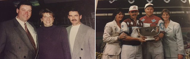 Left: The three Campbells in an earlier year's photo. Jim on the left, sister Jo-Ann centre and John. Right: The Campbell brothers and their wives celebrate a victory. From left Paula, John, Jim and Daria