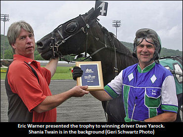 Dave Yarock, a financial planner by trade from Tenafly, hustled his mare Shania Twain to the lead as the field sped away from the starting gate and then they made every pole a winning one en route to a 1:59:3 victory in the $5000 Catskill Amateur Drivers Club Series at Monticello Raceway on Thursday, August 12
