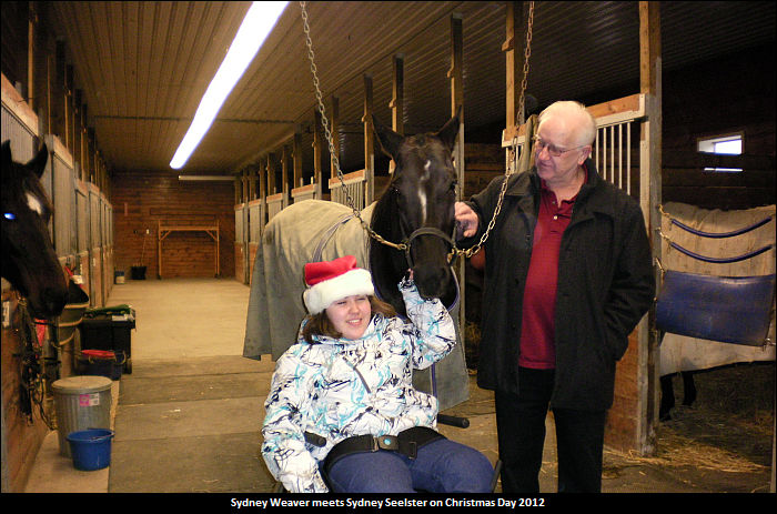 Cesar was writing a Christmas card to the Weavers, and when he phoned to confirm their address, Don, Sydney's father, mentioned to Cesar that Sydney wanted a horse for Christmas. All the while, Cesar’s wife had been researching a horse by the name of Sydney Seelster. They tried to buy the horse outright, but that didn’t work out, so they entered a successful claim on the pacing mare on Sunday, December 23 at Flamboro Downs.