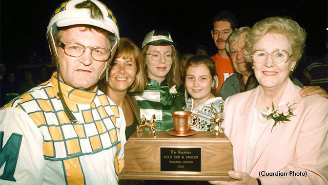 MacDonald in the winner's circle after winning the 1995 Gold Cup & Saucer with Sandy Hanover