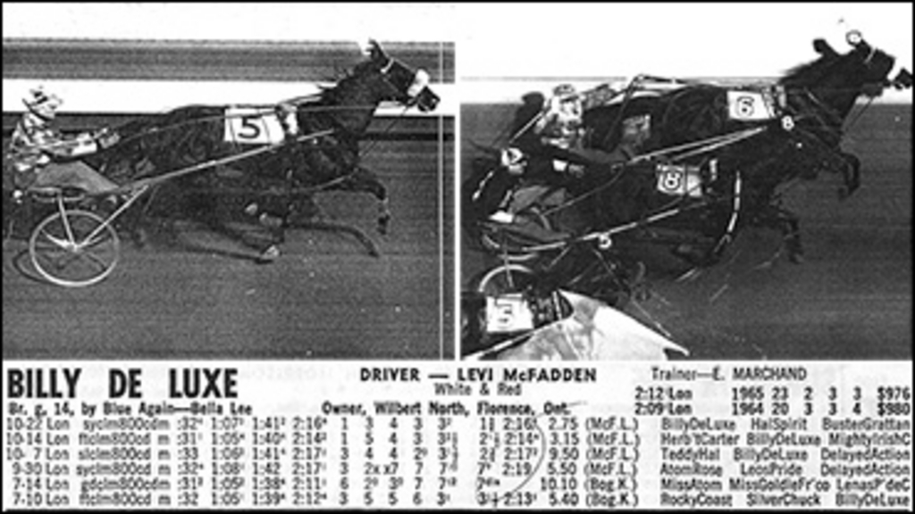 On the evening of December 13, 1965 the racing career of Billy Deluxe came to an end and a happy ending it was. Just as the new and ultra-modern Windsor Raceway -- which had barely been open for two months -- was getting its start, today's subject horse was bidding the racing wars adieu. After that night's opening race was taken by the heavy favourite Marion Dale with Maritimer John Sutherland driving, a much longer priced Billy at nearly 10-1 won the second. As "Smiling" Fred Goudreau returned to the winner's circle for one last picture, the fans lucky enough to be holding a 5-6 Daily Double ticket suddenly became $77.80 richer as the toteboard announced.