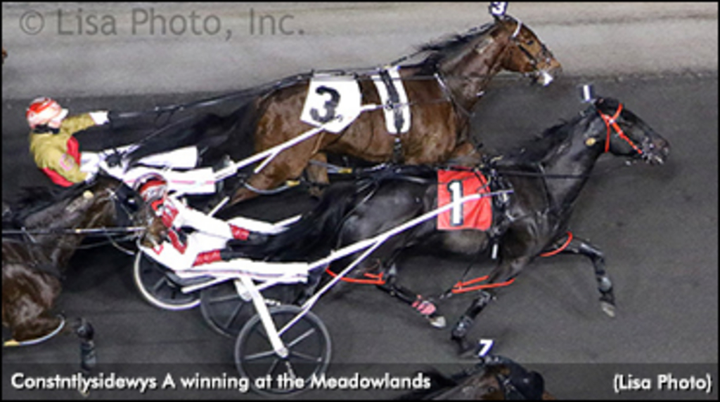 Constntlysidewys A threw a monkey wrench into the machine, going a big mile for owner-trainer Tahnee Camilleri and scoring as the 9-2 fourth choice in the $21,000 Preferred Handicap Pace at the Meadowlands on Saturday, Jan. 12.