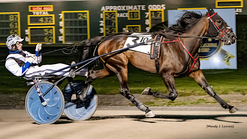 McNeight pushed Livonjaxandqueens to the fore and settled on the lead passing the :28 quarter. With Comet Crusader N (Shawn McDonough) following from second, Livonjaxandqueens got to the half in :57.3 and three-quarters in 1:26.2 where the top two lost touch with the rest of the field. Livonjaxandqueens spun through the final bend and at the top of the stretch, Comet Crusader N pulled and tried to catch the leader. But he came up a half length short as Livonjaxandqueens crossed first in 1:54.3.