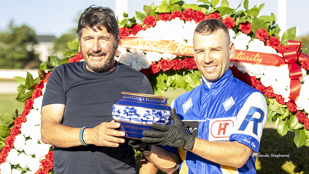 Determination's homebred three-year-old trotting colt Emoticon Legacy braved a strung-out first half from post 10 and proved all grit on the helm to take the 133rd renewal of the $694,444 Kentucky Futurity in a 1:49.2 effort, just one-fifth of a second off the divisional world record, on Sunday, Oct. 5 at The Red Mile. The Grade 1 stakes was sponsored by Hunterton Farm.