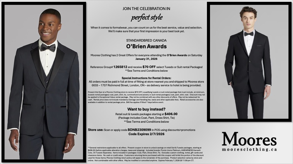 From Jan. 30 to Feb. 1, 2026, the O’Brien Awards will make its debut in London, Ont. — the heart of Southwestern Ontario and a vital community in Canadian harness racing. The weekend will kick off on Friday, Jan. 30, with SC’s annual Board Meeting and All Members Meeting, followed by an evening of live racing at The Raceway.