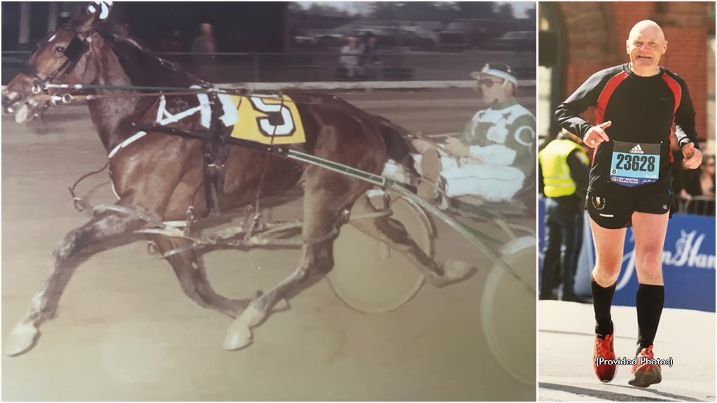 Hector Clouthier pictured driving Bradleys Senora in a 1982 Ontario Sires Stakes event in Dresden and approaching the finish line of the Boston Marathon in 2022 at the age of 72.