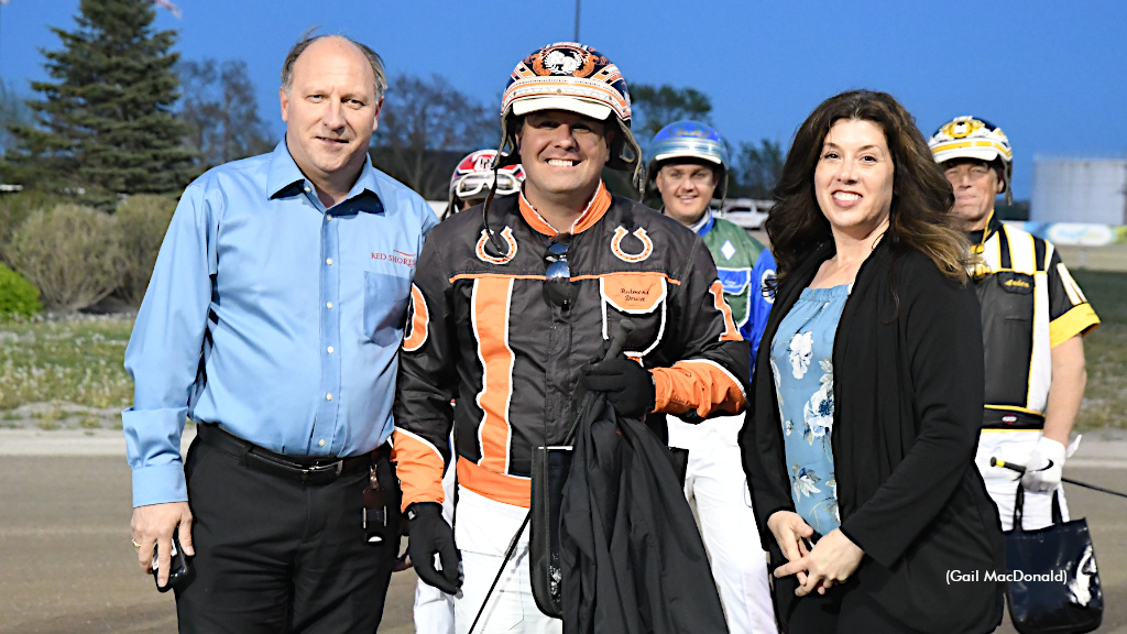 Photo of the 2024 Atlantic Regional Driving Championship winner presentation at Red Shores Racetrack & Casino at the Charlottetown Driving Park. Left to right: Red Shores' Lee Drake, winning driver Redmond Doucet and former Standardbred Canada Director Andrea Rennison.