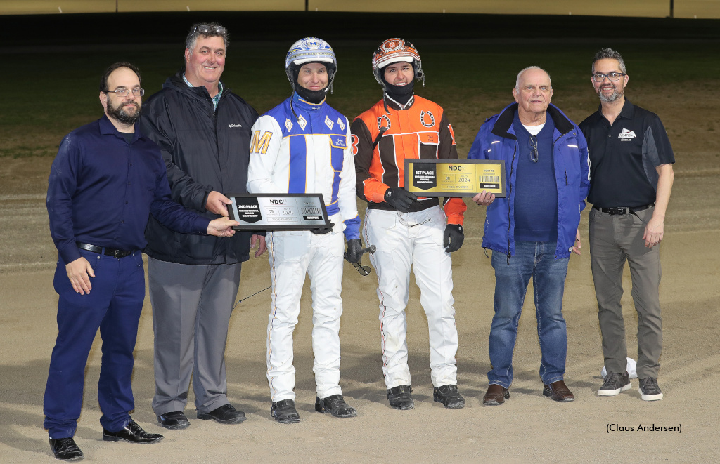 Photo of the 2024 Ontario Regional Driving Championship winners presentation at The Raceway. Left to right: Standardbred Canada President & CEO Darryl Kaplan, Standardbred Canada Director & current Chair Mark Horner, James MacDonald, Tyler Borth, Standardbred Canada Director Bill O'Donnell and Western Fair's Director of Equine Programming Greg Blanchard.