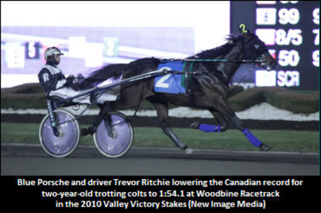 After starting from Post 2, Ritchie and the three-year-old Glidemaster colt got away fourth into the 29-second opening quarter. Ritchie moved the 2010 O'Brien Award winner as Canada's Two-Year-Old Trotting Colt of the Year to the front in the second quarter and clicked off the opening half-mile in :58.3. Ritchie and the career winner of $405,661 were challenged by Pile Driver JT (driven by Scott Zeron) along the final turn, but Blue Porsche was still best by a head at the 1:27.4 three-quarters station. Trotting home with a :28.2 final panel, Blue Porsche, a Canadian Record holder, went on to post a one-length victory over Pile Driver JT in 1:56.1.