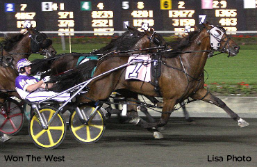 Later in the evening, Won The West rallied four-wide to take the $35,000 prep for the William R. Haughton Memorial for older pacers.