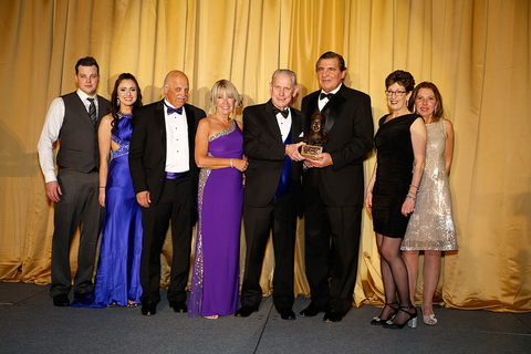 His Worship, Gordon Krantz, Mayor of Milton makes the presentation to the connections of Percy Bluechip. Left to right: Tyler Moore, Rachel Oenema, Dr. Ian Moore, Nancy Moore, Mayor Krantz, Serge Savard, Fiona Reynolds and Diane Currie.