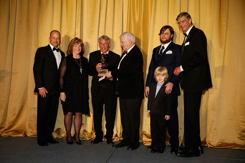 Fred MacDonald, Editor of Atlantic Post Calls and columnist for The Guardian newspaper in Charlottetown, PEI makes the presentation to the winning connections. Left to right: Scott Coulter, Jean & Mileo Monte, Fred MacDonald, Chad Milner, Marcus Milner (in front) and Tom Milner.