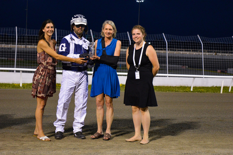 Email this page Printer-friendly version Share with Image Photo Courtesy of Standardbred Canada Marketing Department Guy Gagnon (second from L) receives his EOQRDC trophy from Standardbred Canada's (from L) Hailey Saunders, Kathy Wade Vlaar and Catherine Chouinard