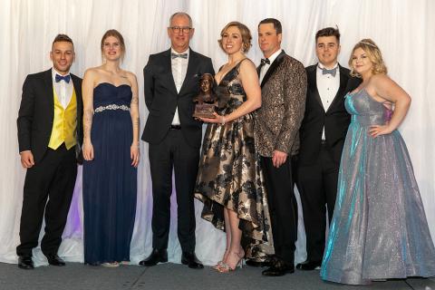 Left to right: Louis-Philippe Roy, Megan Waterman, David MacKenzie, General Manager of Red Shores Racetrack & Casino at Charlottetown Driving Park and Summerside Raceway (presenting), trainer Chantal Mitchell, Kris Dicenzo, Reiley Murphy and Brooke MacPherson.