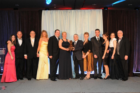 Left to right: Desiree & Joe La Cova, Michael La Cova, Lynn LaCova, Blake MacIntosh, Casie Coleman, Peter Gross, Editor of Down The Stretch, (presenting) Margaret Warriner, Mark MacDonald, Alea Kaufman, Lisa Warren, Ross Warriner.