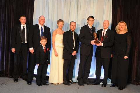 Email this page Printer-friendly version Share with Image Accepting the O’Brien Award are: Thierry Marie, Henrik Hollsten, Anita and Luc Ouellette, Braeden Dziambor (front) Paul DeLean presenting, Fredrik Persson, and Nadja Dziambor.