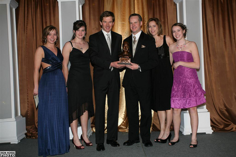 Nick Eaves, president of Woodbine Entertainment Group (third from left) makes the O’Brien presentation to Paul MacDonell. Paul is joined by his wife Lynn (second from right) and daughters Jenna, Shelby and Lauren.