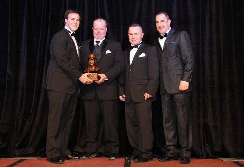 Standardbred Canada Director Darren Crowe (second from left) makes the presentation to Richard Moreau (second from right). Joining them on stage are Gabriel Moreau and Sylvain Filion.