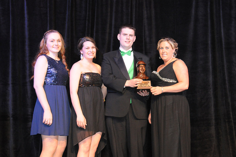 Nicholas Oakes, freelance writer and harness racing columnist with the Charlottetown Guardian (third from left) makes the presentation to (Left to right) Megan Lewis, Becca MacSwain and Jenn Trainor.