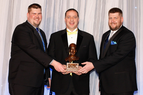 Dan Fisher, Director of Advertising for TROT Magazine, (centre) presents the trophy to Boyd Wilson (left) and Nick Wilson.