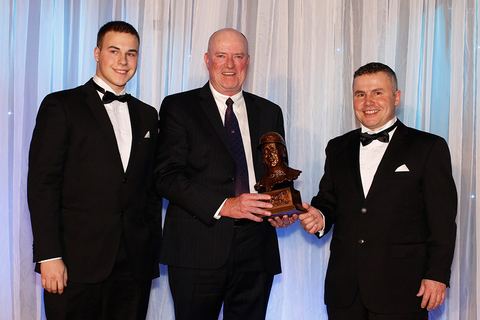 Ken Hardy, President of the Ontario Harness Horse Association (centre) presents trainer Richard Moreau (right) with his second consecutive O’Brien trophy.