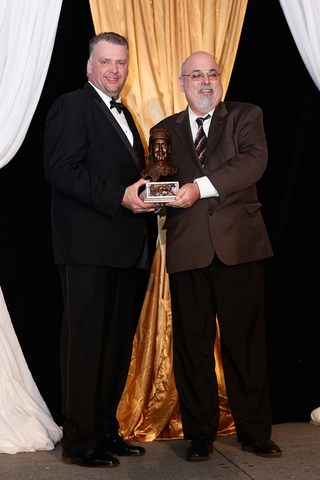 Garnet Barnsdale, freelance harness racing writer for several publications including Down The Stretch, TROT and Woodbine/Mohawk public handicapper for the Daily Racing Form, makes the presentation to Mickey Burke. (left)