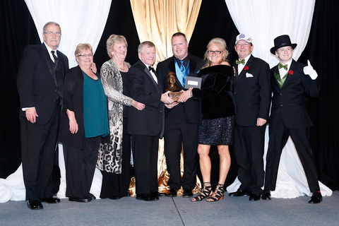 Shannon Doyle, the voice of racing for The Raceway at Western Fair District presents the O’Brien to the connections of Wakizashi Hanover. Left to right: Percy Bonnell, Diane Bonnell, Sheila Kennedy, Bruce Kennedy, Shannon Doyle, Jo Ann Looney King, Jim King, Wyatt Beaver.