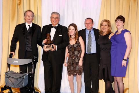 Standardbred Canada Director Richard Veilleux makes the presentation to owners-breeders Al Libfeld and Marvin Katz. Left to right: Al Libfeld, Marvin Katz, Rachel Libfeld, Richard Veilleux, Lynn Katz, Aisling Brewer.