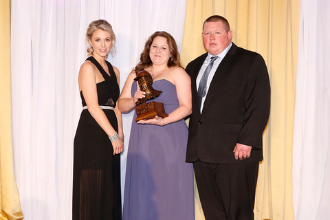 Robyn Crowe, Executive Director of the Nova Scotia Harness Racing Industry Association (left) makes the presentation to Gabriella Sasso, (caretaker of Lady Shadow) and trainer Ron Adams