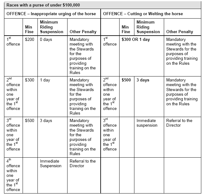 1) This penalty structure provides guidance to Stewards as to minimum penalties for inappropriate urging of the horse, and for the cutting and welting of a horse.