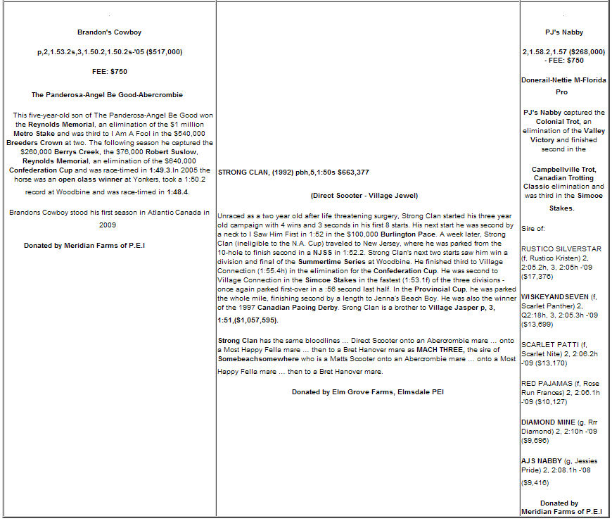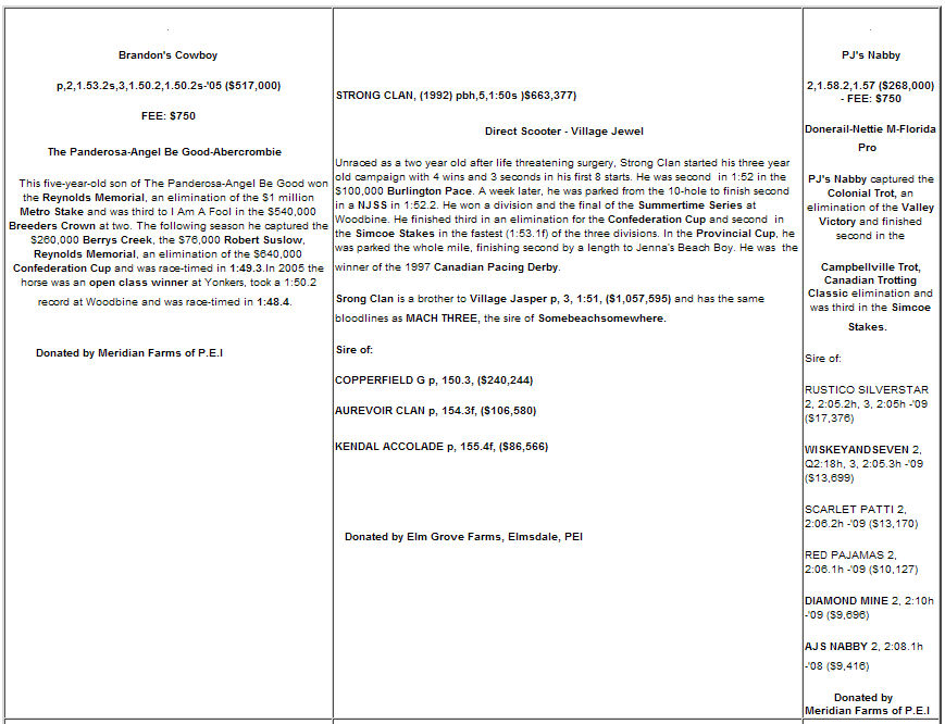 Anyone interested in placing a bid may contact Kingsley Walsh at 902-855-2489 or the MPHRC office at 902-836-5500. Bid sheets will also be available at the HRPEI race office in Charlottetown, the Atlantic Classic Sale in Crapaud, PEI on October 9 and at the NSPE Select Sale in Truro, NS on October 23.