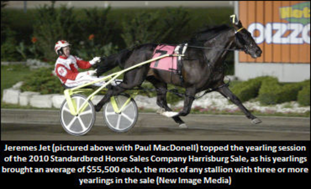 The leading pacing stallion (with three or more yearlings in the auction) was Jeremes Jet. The Ontario-based stallion’s offspring sold for an average of $55,500.