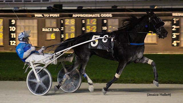 The six-year-old gelded son of Airzoom Lindy ditched his normal tactics of racing off the pace and zipped off the wings to lead every stride of the mile, sawing through panels of :28, :56.1 and 1:24.4 before coasting home in :29.2 to score by 3-1/4 lengths over Max (David Miller), who was in the loose garden spot all the way around. Anchors Away (Braxten Boyd) was third, 10-3/4 lengths away, while Timon AS, posting the fastest final quarter in the difficult surroundings, was fourth. The Lionking AS picked up the nickel in the field of six.