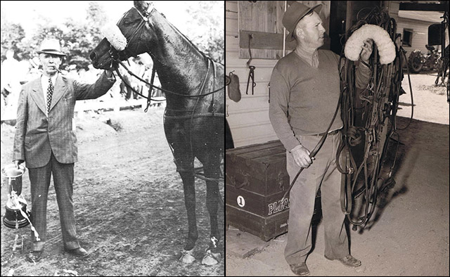 Left: Dr. W.N. Meldrum is shown with his standout horse Sir Esme, a winner at the CNE. Driver Harry Fields is out of camera range. Right: In this undated photo future Hall of Famer Earle Avery is shown tending to his stable duties.