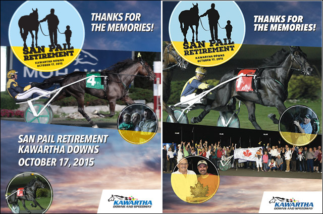 Hughes will bring San Pail to Kawartha on Saturday where he’ll lead the post parade for the San Pail Retirement Trot and then return to the winner’s circle for a retirement ceremony. Fans will have a chance to win a visit on the backstretch with the great trotter. Posters featuring San Pail, including the one designed by Standardbred Canada's Andrea Bertucci plus two assembled by Kawartha Downs (shown below) will be distributed with program coupon while supplies last.