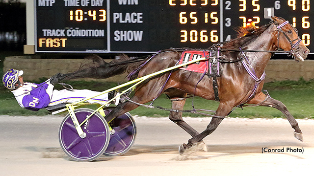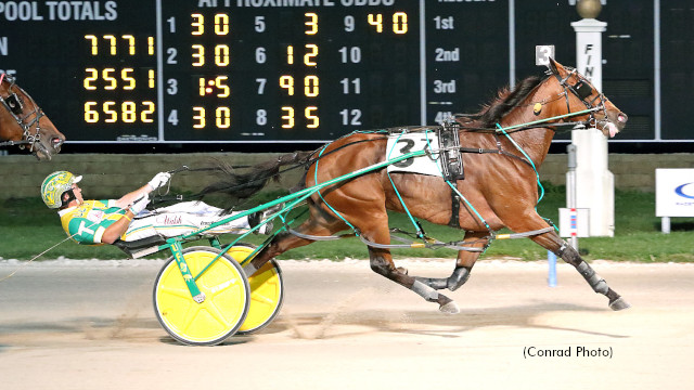 “This horse has taken us on such a great ride,” said trainer Christi Noble, Dan’s wife, while holding their infant son Nash in the winner’s circle. “We made a bridle change this week and it seemed to help,” Dan chimed in. When informed the 1:48 clocking was just one-fifth of a second off the all-time, all-age Hollywood Dayton track standard, Noble said “He had quite a bit left in the tank at the finish.”