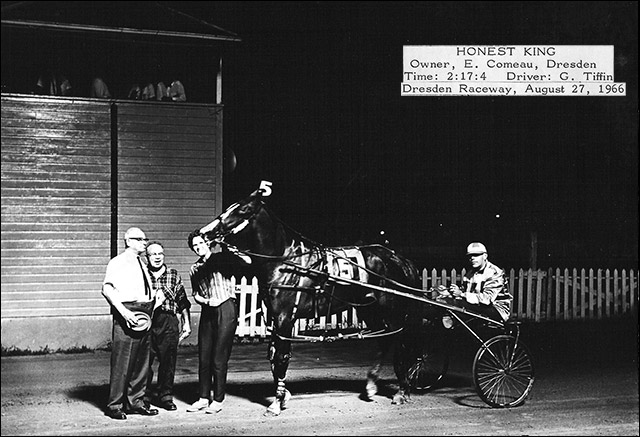 Driver Glen Tiffin is shown in the winner's circle with Honest King as part of the start up of night racing at Dresden in 1966. His wife Marlene who groomed the horse is joined by owner Edgar Comeau (in plaid shirt) also of Dresden. Prominent in the background is the old judge's stand which was part of the original structures.