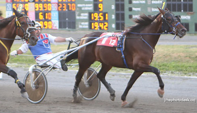 Nobodynosjustice collected his first win in seven starts this season. The gelded son of Justice Hall is trained by Dany Fontaine for owner/breeder Gaetan Bono, Inc. of Montreal and paid $3.40 to win.
